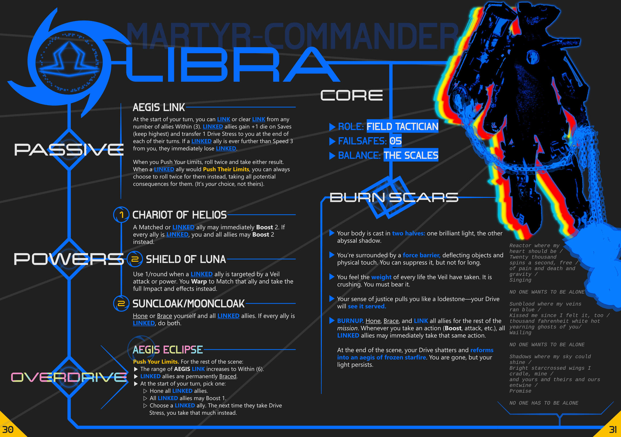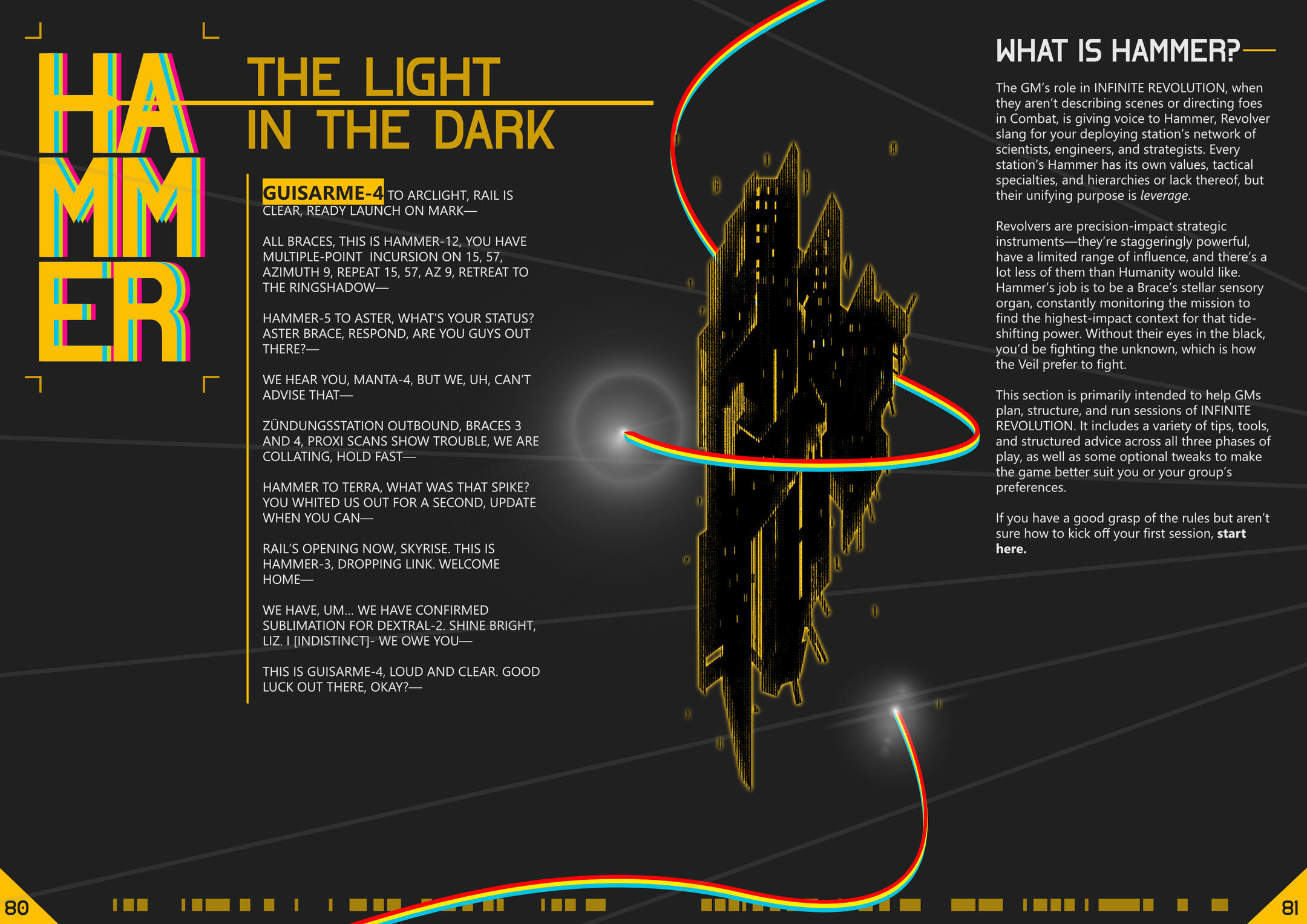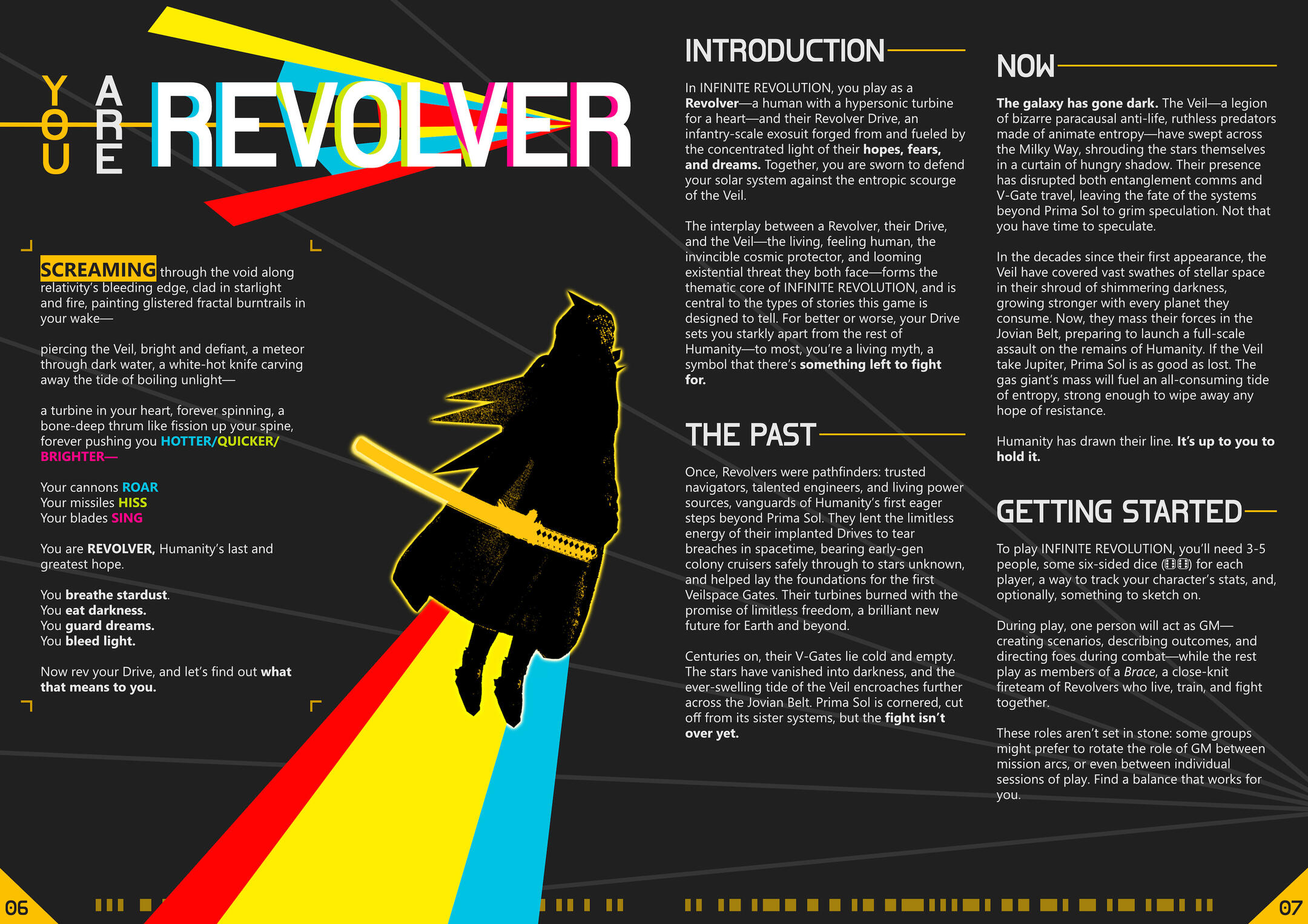 INFINITE REVOLUTION is my first independent RPG project. it's about bright lightspeed exosuits fighting against the scourge of entropy, and takes inspiration from magical girl media, sci-fi cosmology, space combat of all stripes, and my own burning, unflinching hope for humanity. It successfully crowdfunded in 2023 and I learned a lot from making it.